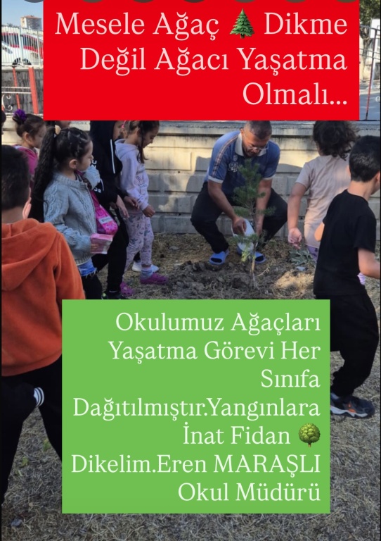 Okulumuz da Dikmiş Olduğumuz Fidanları Yaşatma Görevini Öğretmenlerimiz Rehberliğinde Öğrencilerimize Verdik.Yangınlara İnat Ağaç Dikelim Ama Ağaçları Yaşatalım…Eren MARAŞLI Okul Müdürü.